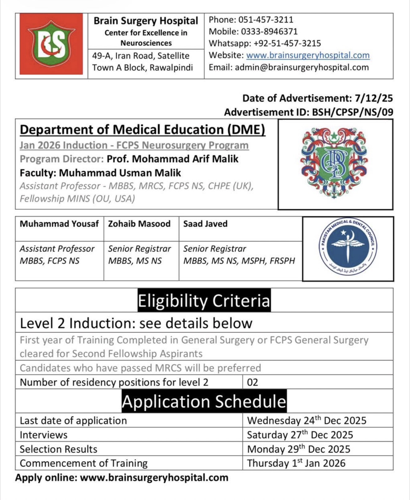 If you are a doctor who has already completed your intermediate module (or first year) in General Surgery and are looking to specialize in Neurosurgery in Rawalpindi, this is a job notice for you. Note that the deadline is December 24th, 2025.